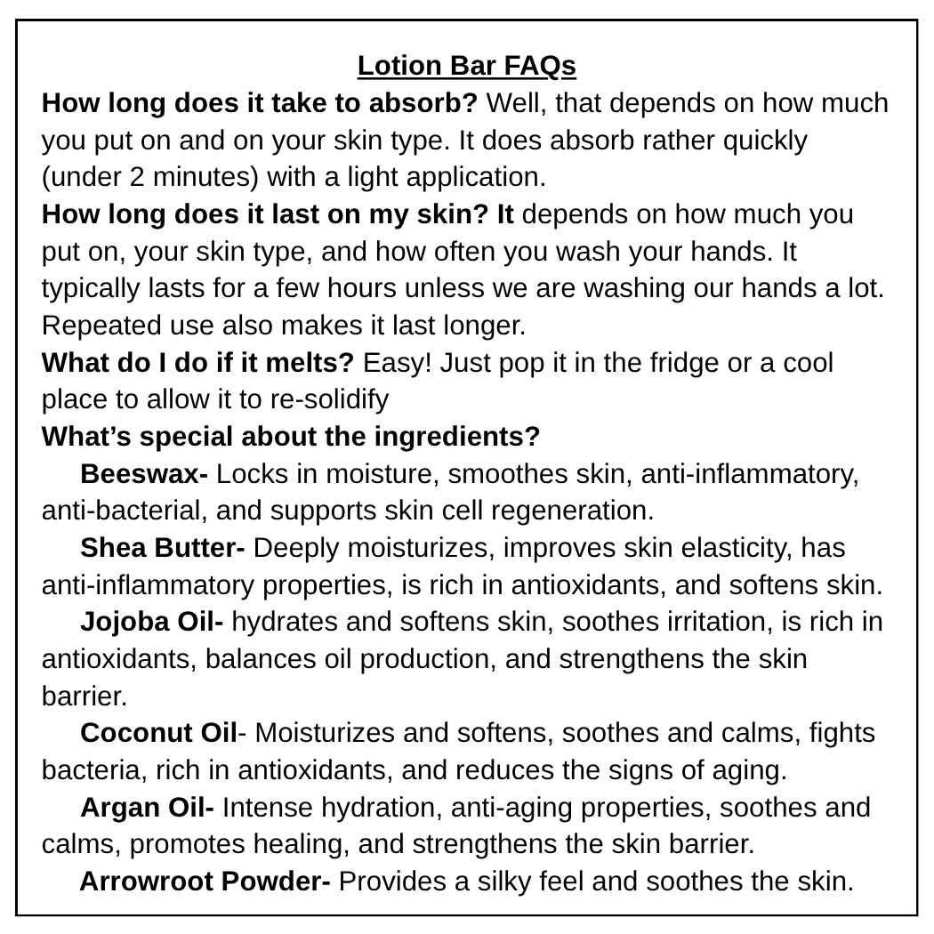 Unscented silky moisturizing lotion bar – (1.3 oz) luxurious and travel-friendly. Made with shea butter, beeswax, jojoba oil, coconut oil, argan oil, and arrowroot powder. The bar has a slight aroma due to its natural ingredients.